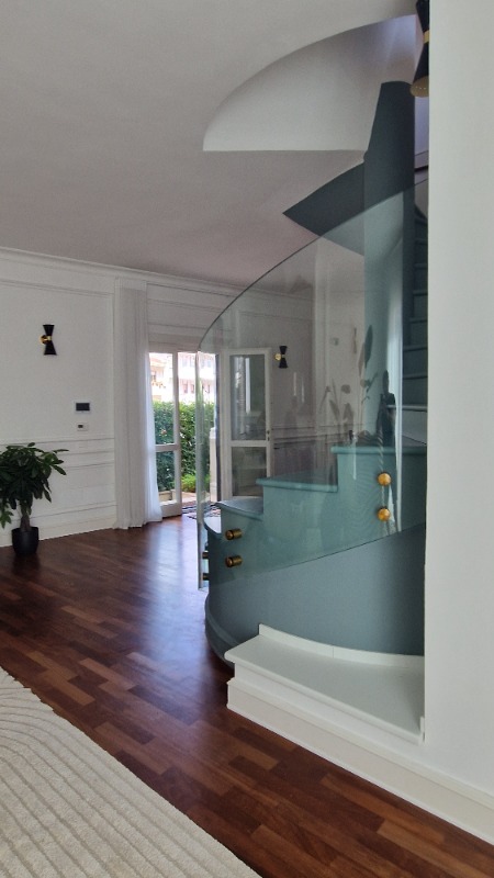 In quest'abitazione di pregio abbiamo provveduto a montare un parapetto in vetro curvo in un unico pezzo come richiesto e dotato di attacchi puntuali in acciaio color oro. Ci siamo occupati della gestione al 100% dal rilievo alla progettazione sin al posizionamento. Il risultato finale parla per noi